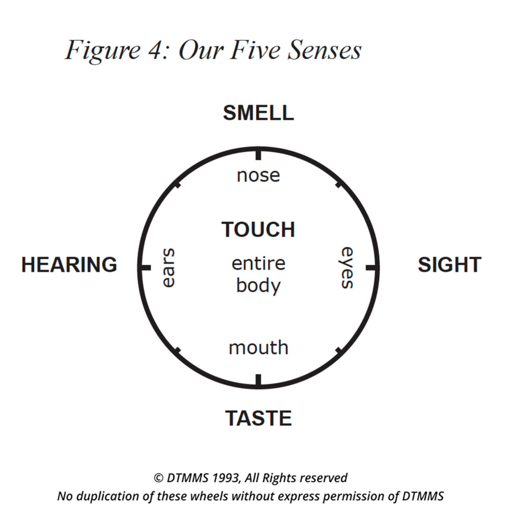 Through our Five Senses, we as humans process our symbols of life’s experiences. These senses are taste, hearing, smell, sight, and touch (see Figure 4). Our senses are intimately related to our sense of balance. Think of the last time you were in a room and the lights suddenly went off, leaving you in complete darkness. Perhaps your steps got shorter, and you began to shuffle. You had to feel around for things and were generally disoriented. When one of our senses is deleted or limited, we experience a loss of balance. On a higher level, our senses are not only important for everyday functioning but also imperative for our survival.